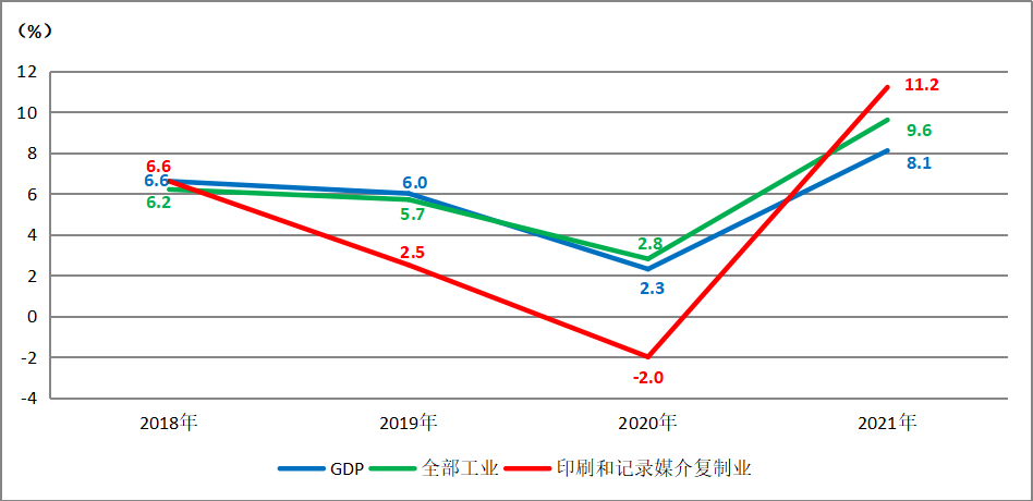 圖1 2018-2021年GDP、全部工業及印刷業增加值年度增速