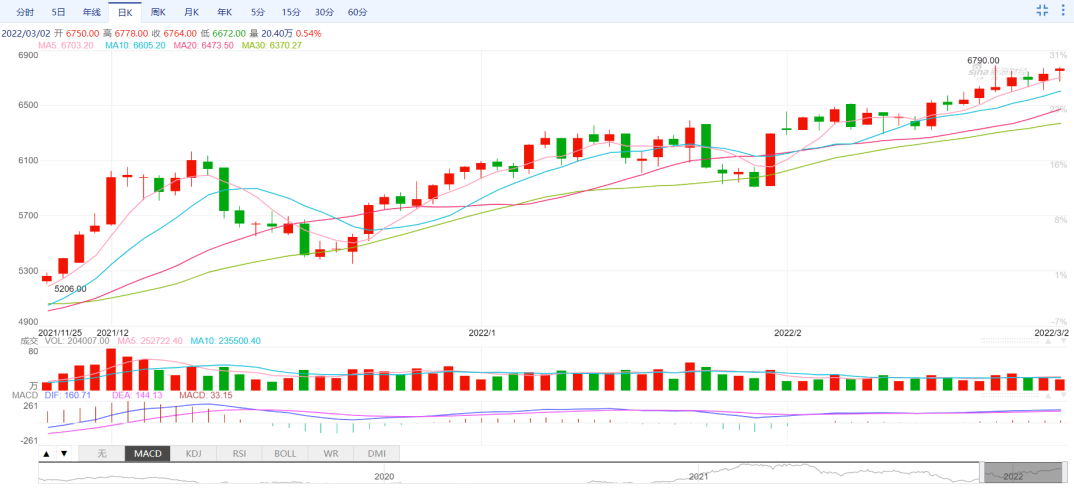 截至3月2日收盤,上期所紙漿期貨主力合約報6764元/噸。