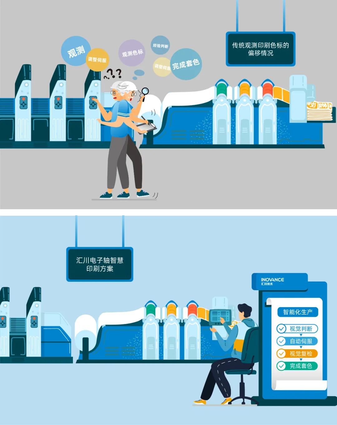 傳統情況下,老師傅觀測印刷色標的偏移情況,通過人眼的經驗判斷,調節自動化設備伺服的旋轉相位,實現套色,需要進行觀測-經驗判斷-調整伺服-再觀測色標-經驗判斷-調整伺服-完成套色;而匯川電子軸智慧印刷方案,師傅只需一鍵打開視覺開關,就可以完成視覺判斷-自動伺服-視覺復檢-套色,實現智能化生產