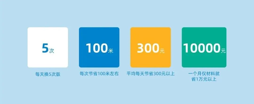 電子軸智慧印刷,可以將此套色工藝進行自動化調整控制,效率高、時間短、人工要求低,為客戶節省大量的開機換型物料損耗,據客戶反饋,每天換5次版,每次節省100米左右,平均每天節省300塊以上,一個月僅材料就省1w以上,除此之外交付時間也大大縮短。