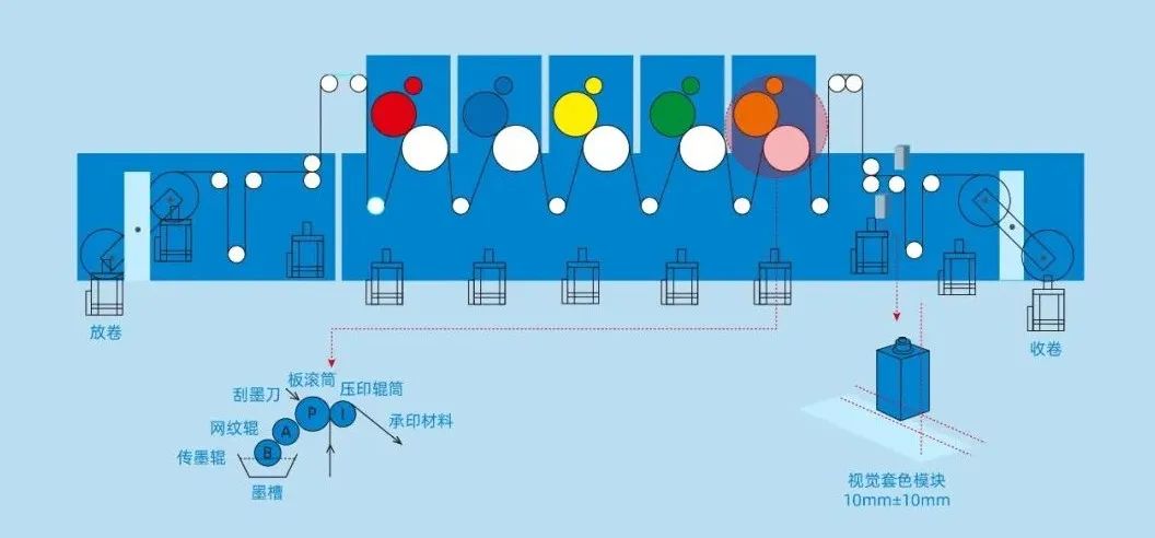 匯川技術電子軸智慧印刷方案是針對印中階段的視覺自動套準方案,通過視覺相機采集柔印與膠印不同色標的信息,進行圖像處理,判斷計算印刷設備不同機組的印刷偏移情況,將糾偏值給到運控控制器  進行伺服糾偏,自動化完成印刷工藝的色標套準,讓客戶實現人工走向智能的跨越式發展,給傳統印刷設備裝上“智慧之眼”!