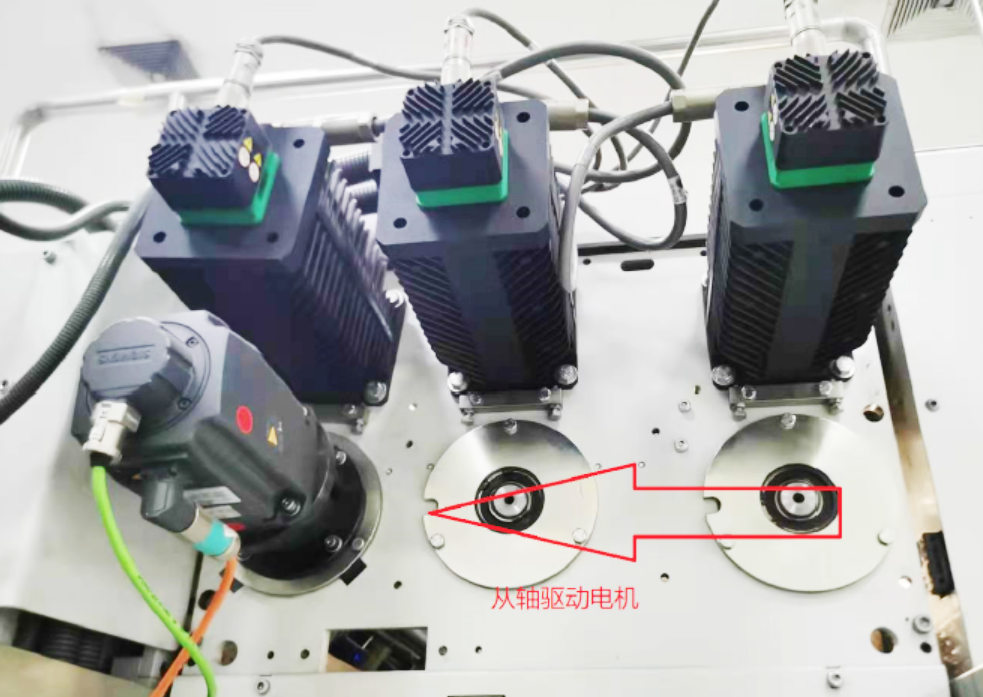 ④全息光標(biāo)套準(zhǔn)同步實(shí)現(xiàn)。由于原設(shè)備進(jìn)紙檢測(cè)光電信號(hào)已做保護(hù)無法讀取,加裝輔助光電檢測(cè)紙料送達(dá)信號(hào)。為讀取設(shè)備主電機(jī)角信息,增加主電機(jī)編碼器,反饋機(jī)器角度到運(yùn)動(dòng)控制器。在研發(fā)過程中發(fā)現(xiàn),主電機(jī)角度與齒輪盤角度存在減速比,比值無法讀取,并且存在累計(jì)誤差,導(dǎo)致獨(dú)立驅(qū)動(dòng)跳步軸輥無法與原跳步輥同步。因此變更初步設(shè)計(jì),將機(jī)器角度讀取點(diǎn)改為燙印齒輪盤部,加裝檢測(cè)編碼器,開發(fā)一種主從追隨的多軸同步控制系統(tǒng)。