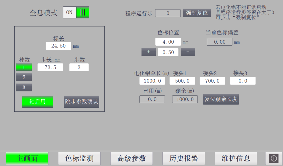 觸摸屏參數(shù)設(shè)置如圖1,包括光標(biāo)標(biāo)長(zhǎng)、輸入色標(biāo)標(biāo)定位置及偏差、跳步選擇、鋁箔參數(shù)。