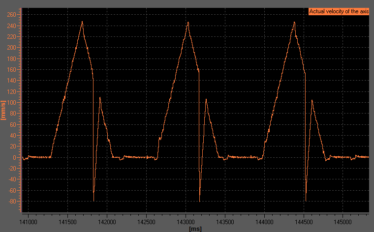 在設(shè)備實(shí)際運(yùn)行過程中,主軸、從軸系統(tǒng)參數(shù)和外部負(fù)載基本一致,從軸慣量與主軸默認(rèn)相等,根據(jù)同步系統(tǒng)主軸從軸誤差對(duì)比調(diào)整,在動(dòng)態(tài)調(diào)節(jié)過程中,從軸追隨主軸誤差最大達(dá)到0.25mm。