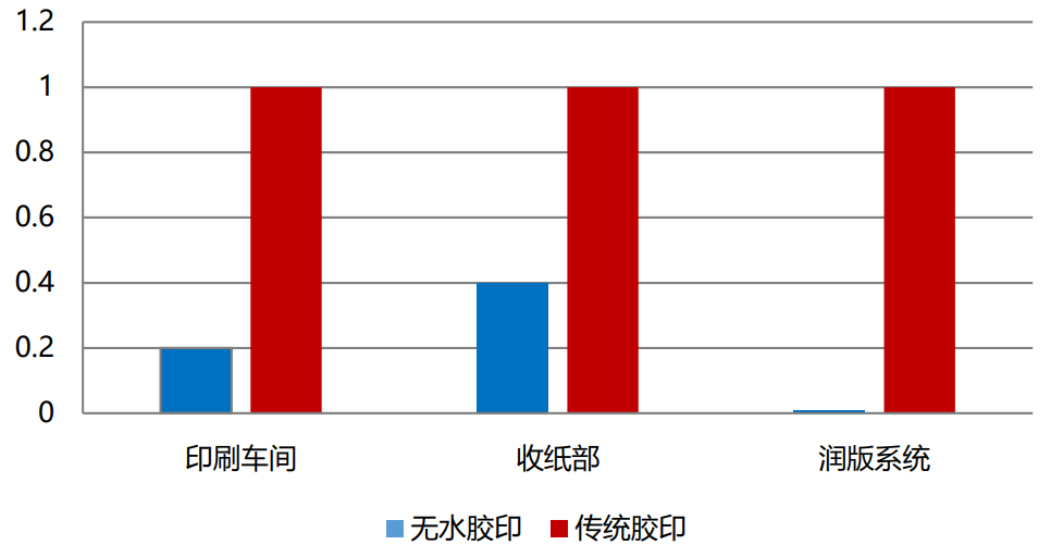 (2)無水膠印不需要使用潤版液,突破了傳統(tǒng)膠印的水墨平衡,減少了印刷過程中VOCs的排放,具有綠色環(huán)保特性。據(jù)國外相關(guān)材料介紹,無水膠印的VOCs排放量比傳統(tǒng)膠印少60%~80%,這一結(jié)果顯示了無水膠印與人類和諧共處的環(huán)保理念。圖2為傳統(tǒng)膠印與無水膠印VOCs排放量對比。