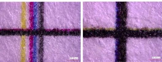圖3 傳統(tǒng)膠印與無水膠印套印對比(左為傳統(tǒng)膠印套印基準線,右為無水膠印套印基準線)