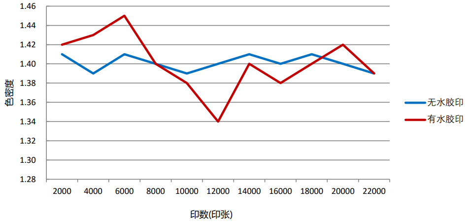 圖1 傳統(tǒng)膠印與無水膠印色密度穩(wěn)定性對比