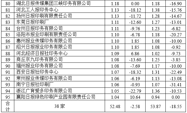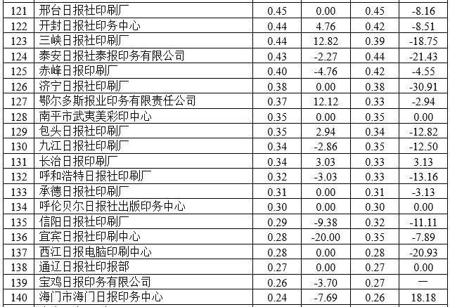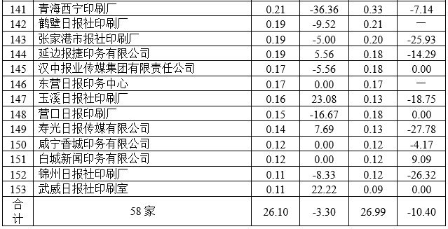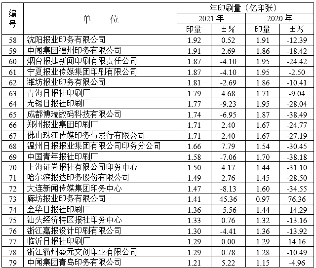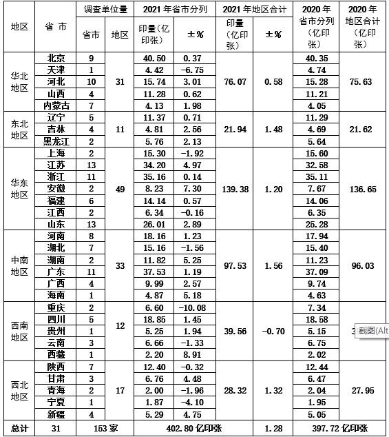 這153家報紙印刷單位2021年的報紙印刷總量是402.80億對開印張,2020年的報紙印刷總量是397.72億對開印張,環比上升1.28%。