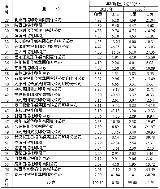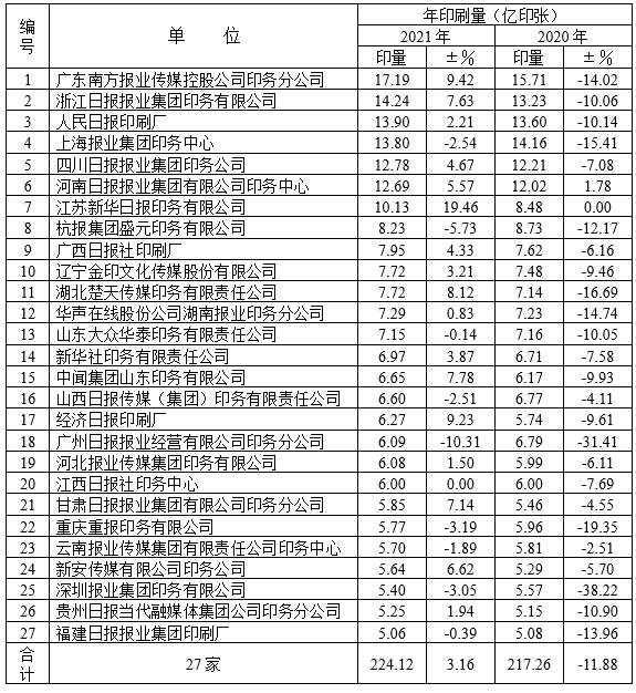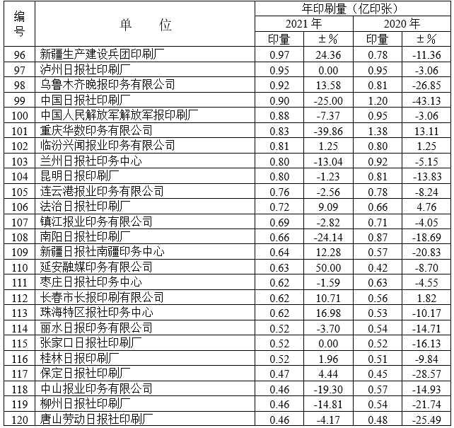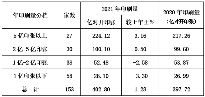 附表1  國內不同規模檔次報業印刷廠2020~2021年的印量匯總情況