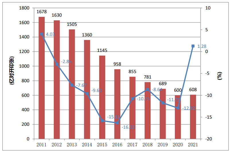 2011年~2021年全國報紙印刷總印量變化趨勢