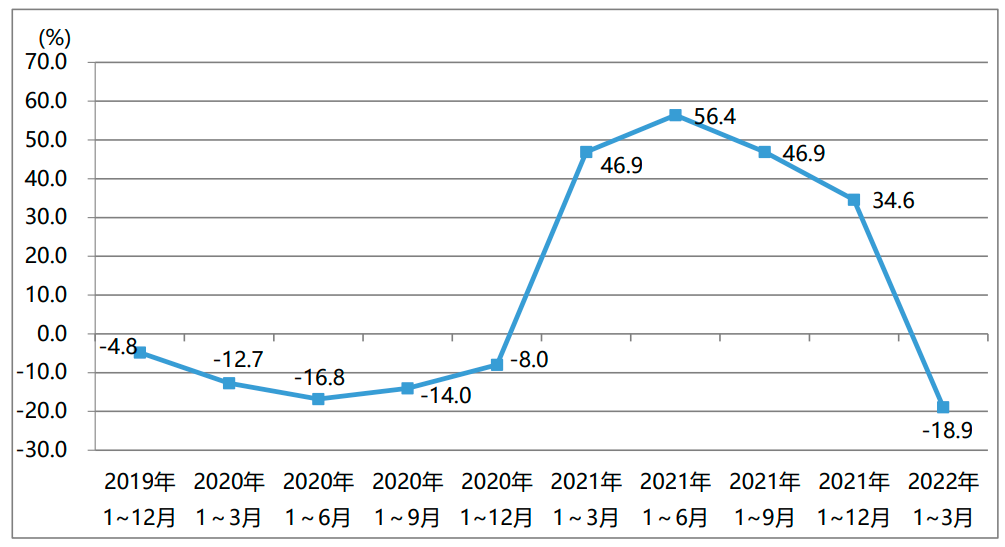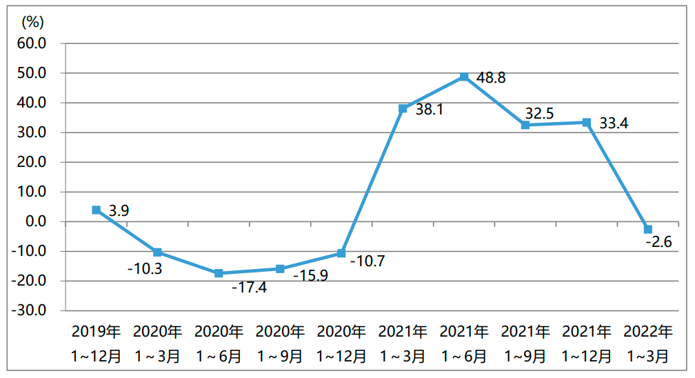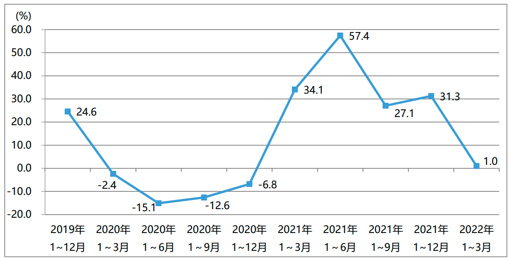 2022年1~3月壓印箔出口額同比增長36.6%,如圖32所示。