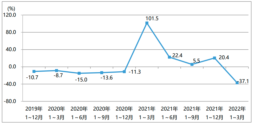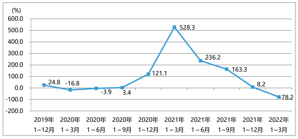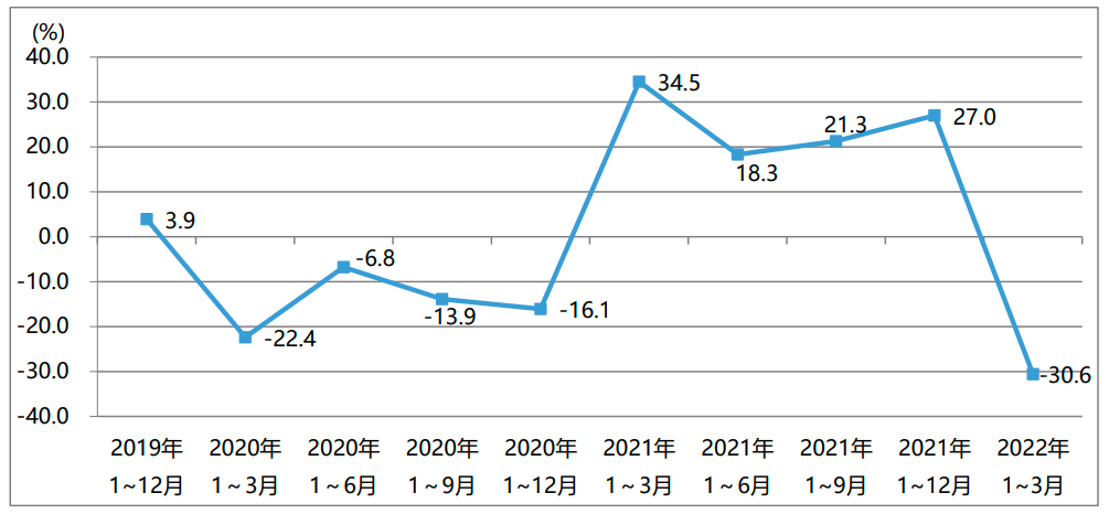 2022年1~3月,我國印前設備進口額降幅明顯,同比下降30.6%,如圖7所示。