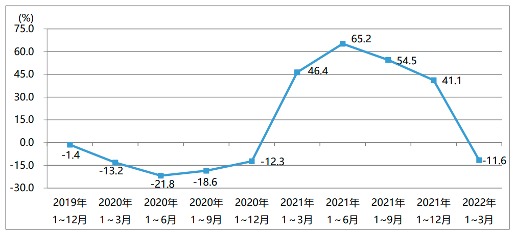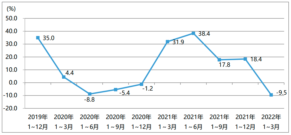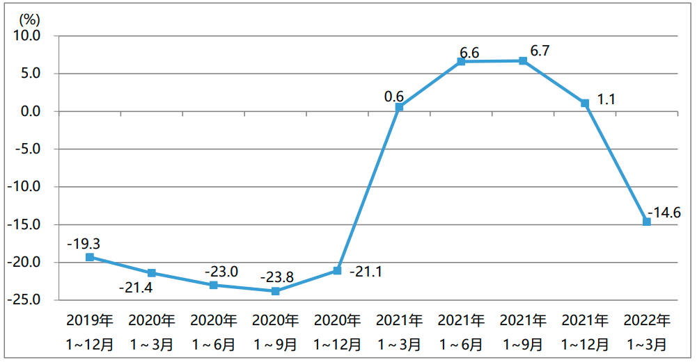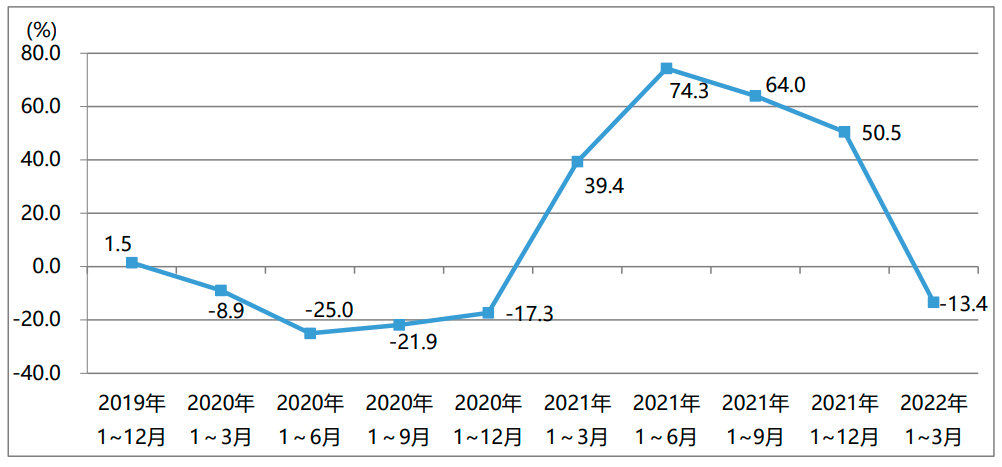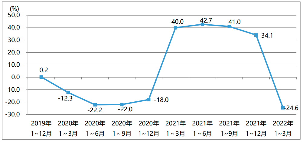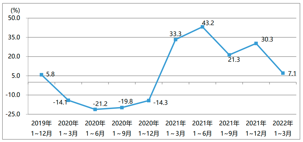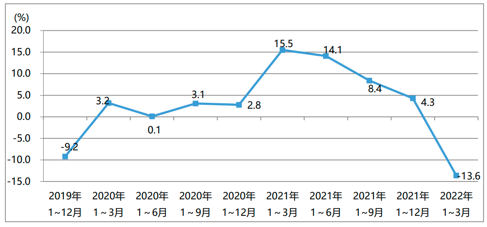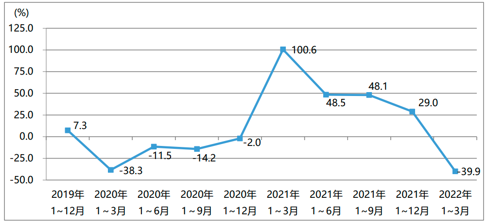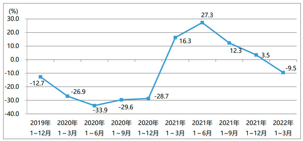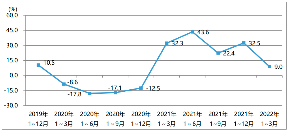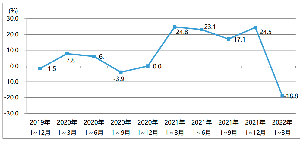 2022年1~3月,我國印刷裝備及器材出口額為11.01億美元,與2021年1~3月的10.10億美元相比增長9.0%。圖23為我國印刷裝備及器材出口額增長率。