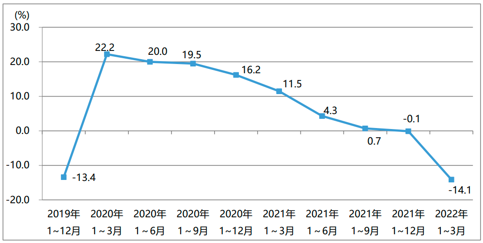 2022年1~3月,我國印刷裝備及器材進口額為5.87億美元,與2021年1~3月的7.24億美元相比下降18.9%,降幅高達兩位數,而2021年全年我國印刷裝備及器材進口額皆保持了兩位數的高速增長。主要原因,還是緣于2022年以來受國內多地疫情反復導致的企業生產以及物流運輸受阻,以及國際地緣政治沖突等突發因素。圖2為我國印刷裝備及器材進口額增長率。