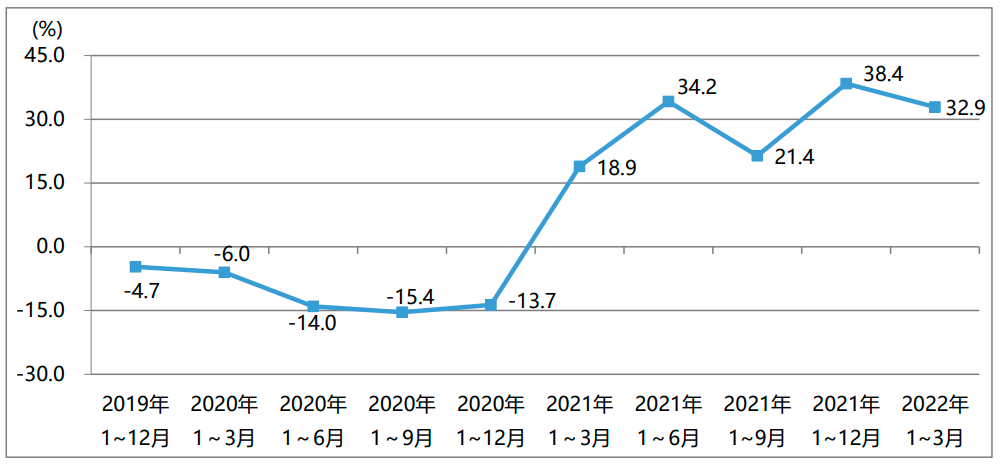 2022年1~3月印刷油墨出口額同比增長32.9%,如圖31所示;