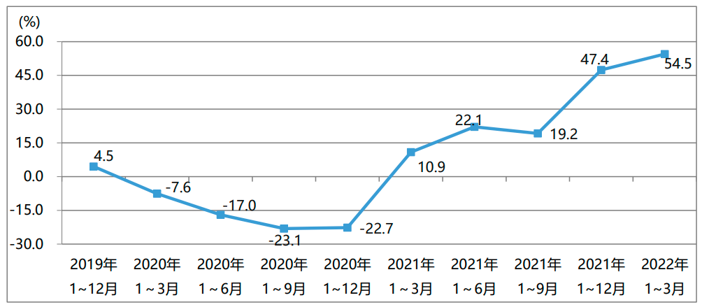 從出口額增長情況來看,2022年1~3月膠印版材出口額同比增長54.5%,如圖30所示;