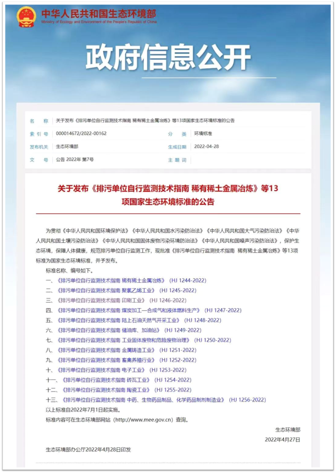 為改善生態環境質量,指導和規范印刷工業排污單位的自行監測工作,由生態環境部生態環境監測司、法規與標準司組織編制的《排污單位自行監測技術指南 印刷工業》強制性標準,該標準自2022年7月1日起實施,適用于印刷工業排污單位在生產運行階段對其排放的水、氣污染物,噪聲以及對周邊環境質量影響開展自行監測。