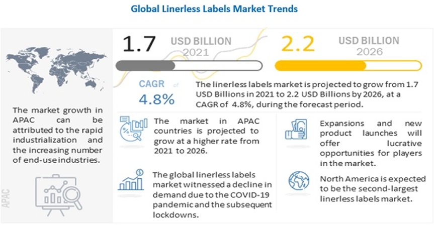 美國市場調查與咨詢公司Markets and Markets曾發布一份“2026年全球無底紙標簽市場預測”的報告。根據報告數據顯示,全球無底紙標簽市場規模預計將從2021年的17億美元增長到2026年的22億美元,年復合成長率為4.8%。