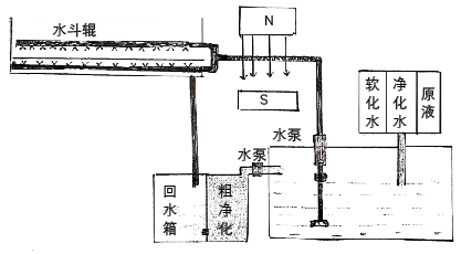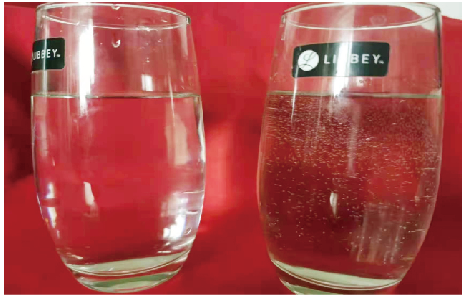 磁化凈水器最初是家庭用水使用,由凈化和磁化兩部分組成,具有防垢、除垢、緩蝕、分離凈化、殺菌等功能。磁化原理如圖1所示,一定速度的水流通過一定磁場的垂直切割磁力線,在磁場作用下,氫鍵被破壞,氫鍵鍵角由104.5°降低到103°,將大分子集團分解成較小的分子集團,甚至是雙分子集團,磁力促使分子間動能增加,理化性質發生變化,水分子間聚集程度減少,表面張力減小,黏度與密度減小,溶氧量增加,活性增強,滲透壓溶解度變大等,進而有利于各種物質運輸與溶解。圖2為普通水與凈化磁化水對比圖。