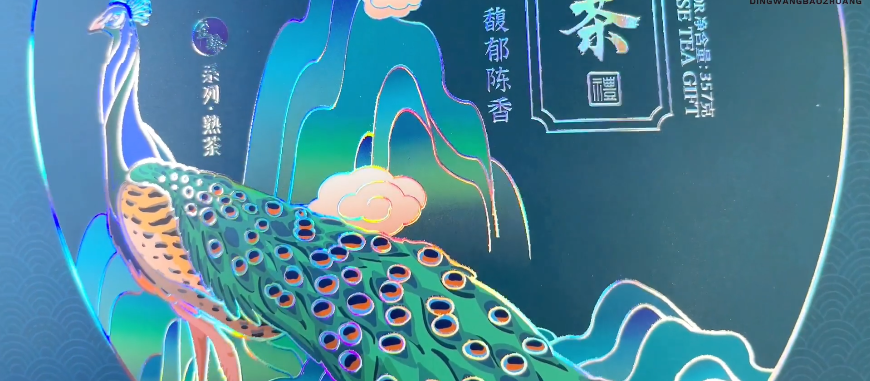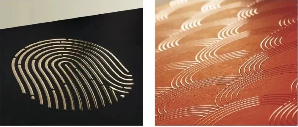 如上圖所示,利用數字噴印的墨層實現線性變化,有效結合了數字燙金,將產品從平面提升到三維的視覺和觸覺,增加物體的質感,體現了山脈的起伏、孔雀羽毛的層次感,增加了立體效果。