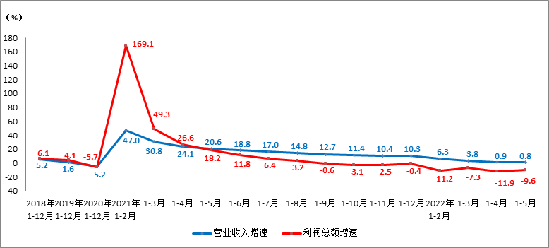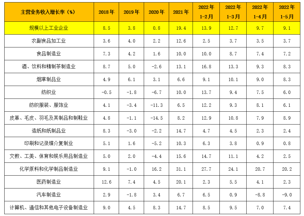 表中顯示,2022年1-5月全部工業(yè)主營業(yè)務(wù)收入平均增長為9.1%,較上月微降。