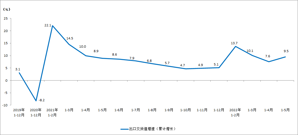 2022年1-5月,印刷業(yè)出口交貨值同比增長9.5%,較1-4月有所提升。5月份,印刷業(yè)出口交貨值同比增長14.4%,一改3月4.3%、4月1.2%的低迷狀況,強力拉升了1-5月的累計增速。