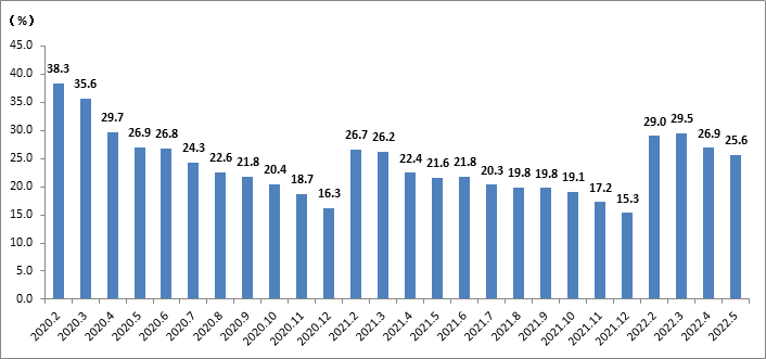 2022年5月,印刷業(yè)規(guī)模以上企業(yè)的虧損面為25.6%,虧損企業(yè)的虧損總額增長了34.3%。相比上月,虧損面、虧損總額均有所減少。但由圖3中可以看出,今年以來各月虧損面,相比去年同期,均有所抬高。