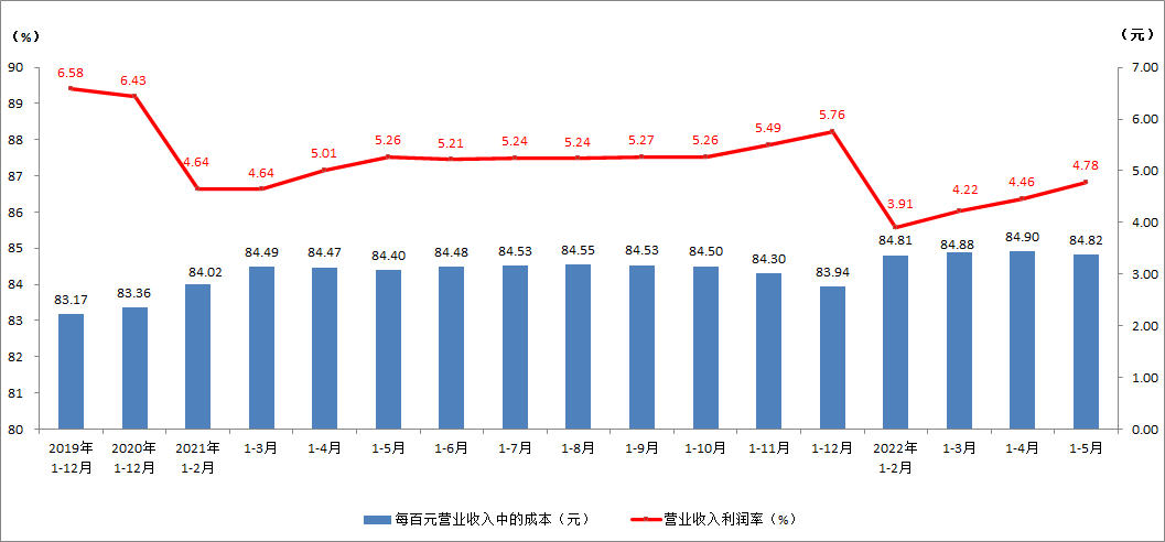 2022年1-5月,印刷業(yè)每百元營業(yè)收入中的成本為84.82元,高于全部工業(yè)84.42元的平均水平。這一數(shù)字,相比去年同期84.40元,也有所提升。