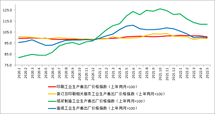 印刷工業(yè)生產(chǎn)者出廠價格指數(shù)5月有明顯的下降走勢;裝訂及印刷相關(guān)服務(wù)價格指數(shù)基本與上月相同。