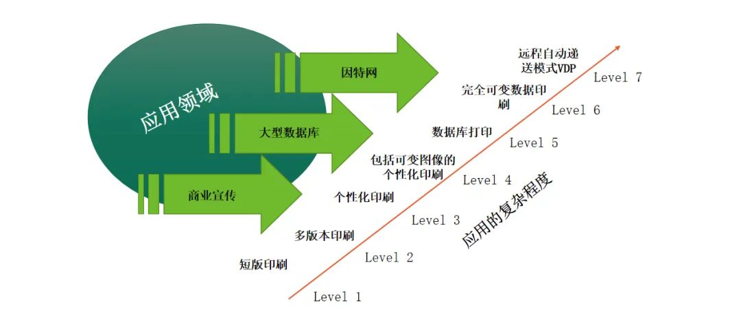 柯達(dá)中國當(dāng)年描述的數(shù)字印刷應(yīng)用領(lǐng)域圖,清晰展現(xiàn)了隨著技術(shù)發(fā)展,數(shù)字印刷可以達(dá)到的復(fù)雜程度,從普通商業(yè)宣傳的短版印刷,到利用互聯(lián)網(wǎng)的遠(yuǎn)程自動遞送模式。