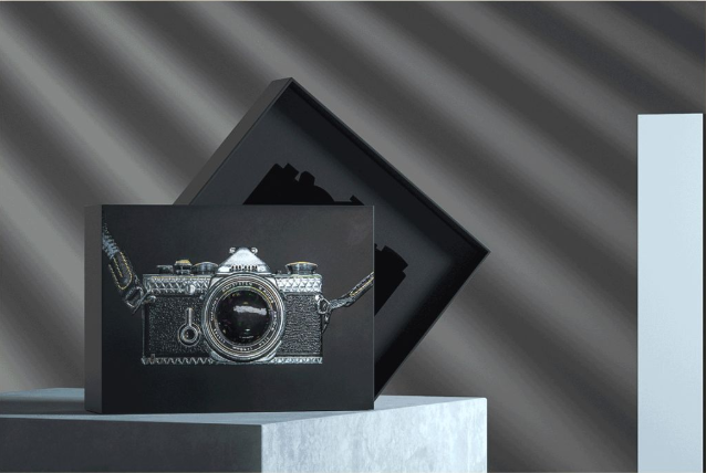 包裝外觀運用時髦的紳士黑,恰似深邃而純凈的天空背景,以純色質感襯托星光般的卓越工藝。該包裝運用擊凸工藝,還原真實的相機鏡頭效果,層次豐富有光澤。相機表面采用3D UV磨砂工藝,模擬復古相機表面觸感,在細節處采用了3D燙銀,勾勒相機高級質感。相機圖案頂部細節處使用了燙鐳射銀,在光影下絢爛奪目。
