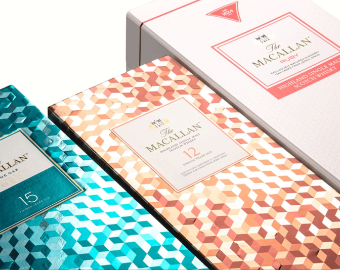 有“純麥威士忌酒中的勞斯萊斯”美譽之稱的麥卡倫,推出年份系列包裝,融合多種色彩與多重工藝,呈現高級酒品包裝的多種可能。