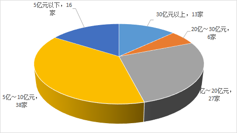 細分百強榜單,百強企業的規模結構如圖2:銷售收入30億元以上的企業,13家;20億~30億元,6家;10億~20億元,27家;5億~10億元,38家;5億元以下,16家。百強企業的平均規模為16.88億元。