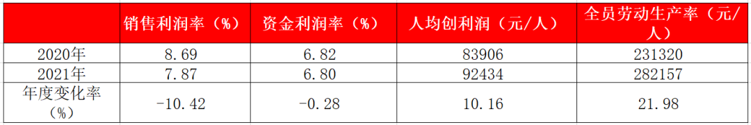 表1中,我們試圖用更為綜合的經濟效益指標,對比分析78家百強企業兩年間的收益變化情況。我們發現78家企業,銷售利潤率和資金利潤率呈下降趨勢,人均創利潤和全員勞動生產率則是增長態勢。其中,銷售利潤率下降9.44%,資金利潤率下降0.29%,人均創利潤增長10.16%,全員勞動生產率增長21.98%。可以看出,百強企業一方面受原材料、人力成本上漲影響,銷售利潤率下降幅度加劇;另一方面隨著自動化、智能化發展,人均利潤和全員勞動生產率雙提升,減員增效明顯。