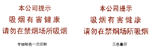 組成專咖啡色的黑色、紅色、黃色分別做了加網處理,如果網點比例不對,就會出現墨色不準的問題。為了確保網點比例能夠達到原專咖啡色的效果,我們做了幾種網點比例的測試。與標樣或原稿對比之后,最后確定黑色加網80%、紅色加網55%、黃色加網85%,三色疊印后能達到專咖啡色的效果,且肉眼看無虛邊偏位,如圖5所示。