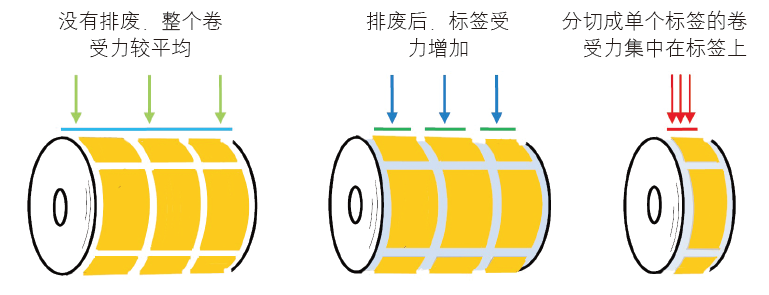 如果排廢邊的面積與標(biāo)簽面積相同,那么排廢后標(biāo)簽承受的擠壓力應(yīng)是原來(lái)的兩倍。舉例來(lái)看,如圖2所示,原來(lái)承受3kg重力(約為29.4N),現(xiàn)在承受的就是6kg重力(約為58.8N)。當(dāng)將3拼的卷分成3個(gè)小卷時(shí),原來(lái)平均攤在3個(gè)標(biāo)簽上的擠壓力又全部集中到一個(gè)標(biāo)簽上,那么單個(gè)小卷上承受的擠壓力是排廢卷的3倍,更是印刷卷的6倍。通過(guò)計(jì)算,我們可以認(rèn)識(shí)到張力的影響力。因此,小卷的收卷張力應(yīng)設(shè)置得更小一些。
