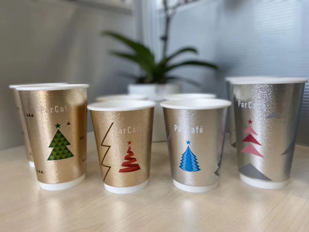 作為世界第二大包裝國,中國包裝市場潛力巨大,特別是一些大中型城市正在圍繞文化創意和網絡經濟為特色,打造全新的城市發展規劃,極具視覺沖擊的新型包裝搭配各類快消品,更能吸引21世紀年輕消費群體。例如,現有咖啡杯、奶茶杯材料都是普通紙杯紙淋膜PE,不僅視覺上千篇一律,而且PE淋膜不環保,不符合包裝去塑的發展要求。如果將真空轉移型噴鋁紙應用到紙杯上,特有的金屬質感和炫酷的鐳射全息效果,能使紙杯的視覺效果更好(如圖8),符合年輕消費者的喜好,再通過無塑涂層替代PE淋膜,從結構上進行升級,更符合環保可回收的發展趨勢。可見,全息真空轉移型噴鋁紙可在更多包裝產品上應用,市場前景廣闊。