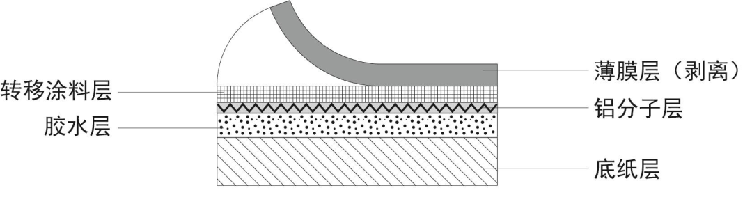 真空轉移型噴鋁紙是在BOPET薄膜表面先涂布一層轉移型水性涂料,接著在BOPET薄膜涂料面進行鋁分子真空蒸鍍,再將鍍鋁后的BOPET鍍鋁膜通過膠黏劑與紙張進行復合,同時連線將BOPET薄膜剝離,紙張表面留下了帶有可印刷轉移涂層的鋁分子層,如圖3所示。