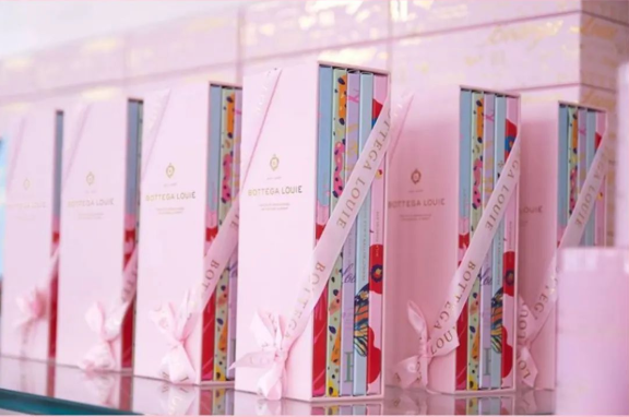 在選擇包裝精美的甜點禮物時,Bottga Louie的甜品禮盒是不二之選。這款巧克力禮盒由俱進包裝生產制造,5種不同口味的巧克力塊裝入插盒中,禮盒外用精致的蝴蝶結絲帶系好,恰似一組整齊劃一的典藏書籍。