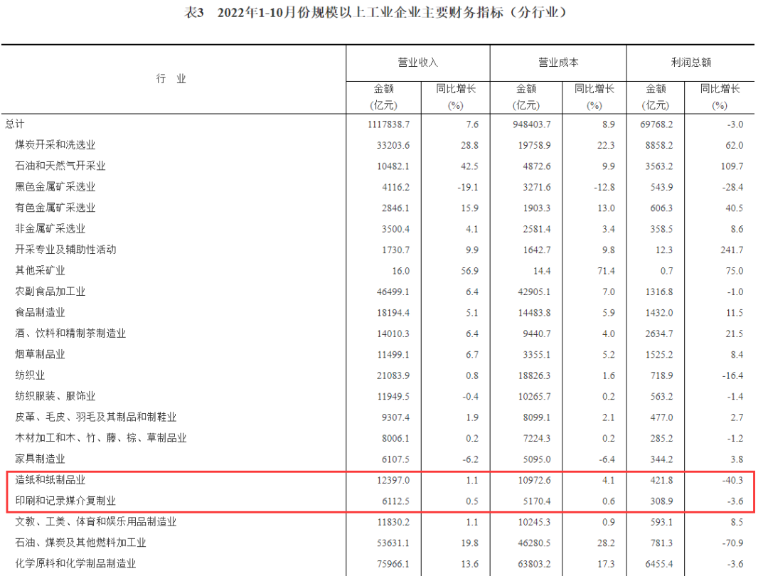 其中,造紙和紙制品業實現營業收入1.24萬億元,同比增長1.1%;利潤總額421.8億元,同比下降40.3%。印刷和記錄媒介復制業實現營業收入6112.5億元,同比增長0.5%;利潤總額308.9億元,同比下降3.6%。