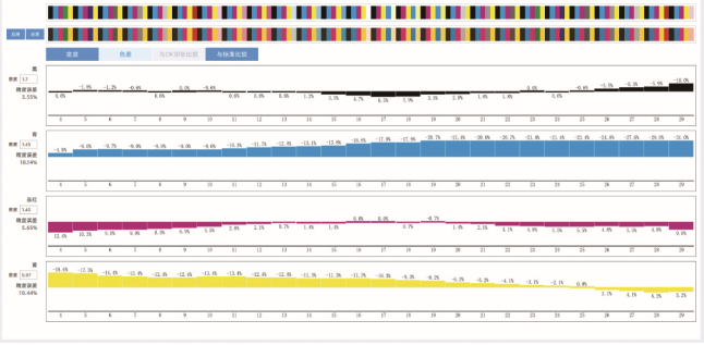 如果各墨區(qū)的密度出現(xiàn)明顯變化趨勢,如圖4,C密度左低右高,Y密度左高右低,M密度明顯中間高、兩邊低,說明下墨不平,建議調(diào)整墨輥壓力或者更換墨輥。