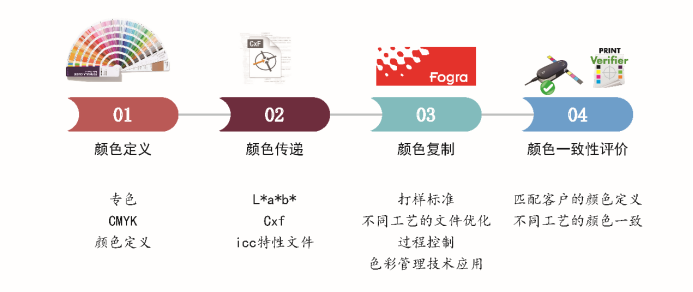 對于色彩管理的概念,大家并不陌生。學(xué)術(shù)界從廣義上定義的色彩管理,即從顏色定義、顏色傳遞、顏色復(fù)制到顏色一致性評價(jià)整個(gè)流程的顏色管理,如圖1所示;生產(chǎn)中大多數(shù)人所理解的狹義上的色彩管理,即印前屏幕軟打樣、數(shù)碼打樣與印刷顏色的匹配;更有甚者將油墨預(yù)置技術(shù)也叫做色彩管理,即把各色組各墨鍵油墨信息傳遞到膠印機(jī),替代人工抓墨。
