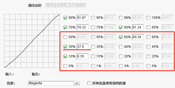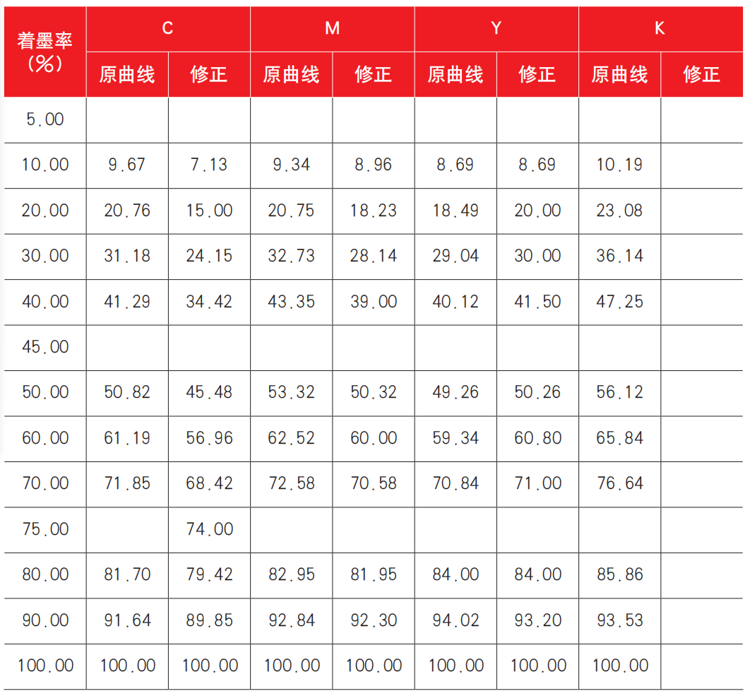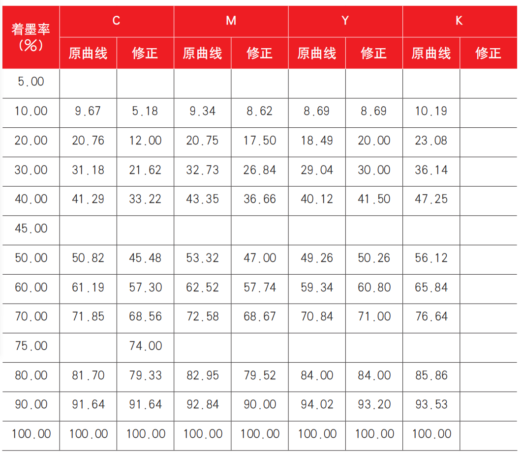 在公司色彩管理技術應用和管理推進工作中,數碼打樣和印刷機臺ICC的匹配,使印前技術人員明確了思路,敢于在曲線調整中大膽修正數據。以下數據調整全部基于標準數碼樣張和客戶來樣對比后得到。
