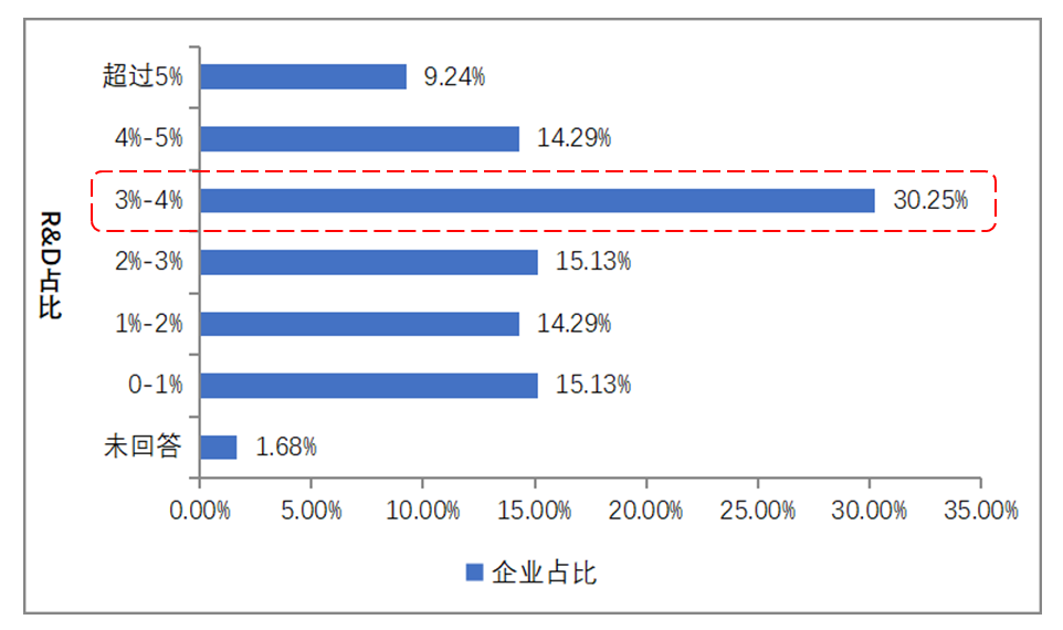 今年的調(diào)查中,樣本企業(yè)2021年R&D占比平均為2.83%。其中,R&D占比最高的企業(yè)為8.26%。請看圖2中,R&D占比在3%-4%的企業(yè)最多,有超過30%的企業(yè)集中在這個區(qū)域。