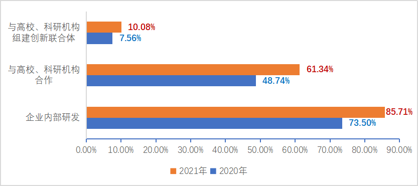 從圖5中可以看到,六成以上的樣本企業(yè)選擇與高校、科研機構合作,更有1成企業(yè),與高校、科研機構組建創(chuàng)新聯(lián)合體,探索更緊密的合作方式。這兩項占比,2021年相比上年都有所提升。
