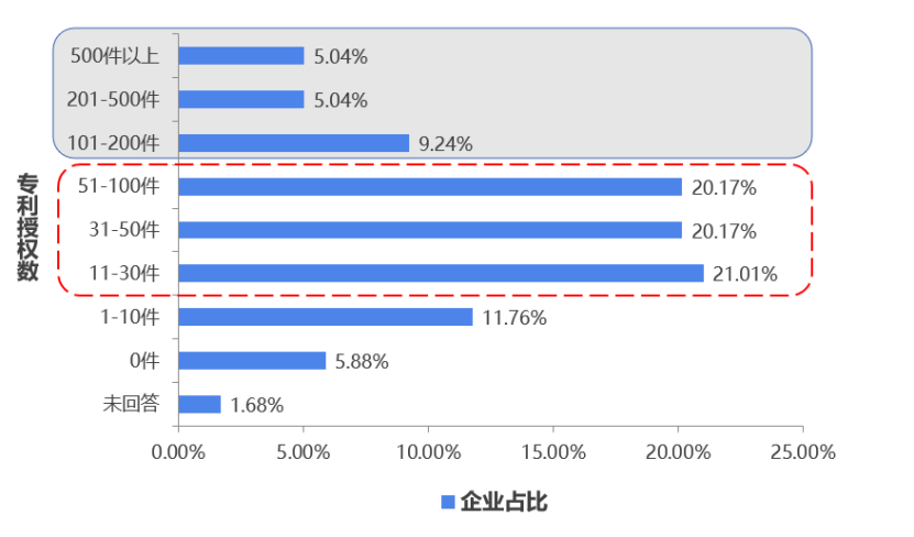 大家請看圖6,樣本企業(yè)擁有專利數(shù),集中在11-30件、31-50件、51-100件這3個區(qū)域,各占比兩成。只有近兩成企業(yè),擁有的專利數(shù)超過100件;其中有10%的企業(yè),擁有專利授權數(shù)超過200件。