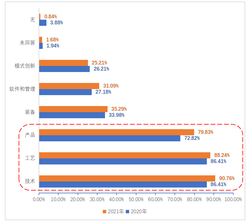 與此同時,也有近兩到三成的樣本企業(yè),會部署裝備、軟件和管理、模式創(chuàng)新這幾個方向的研發(fā)。