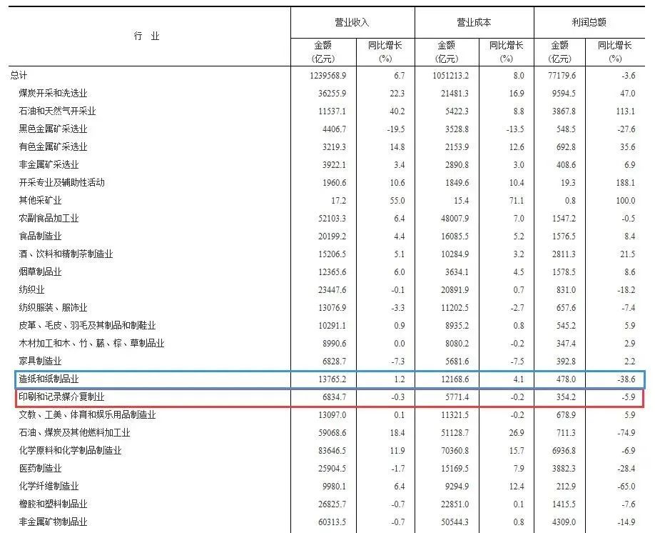 值得關注的是,造紙和紙制品業實現營業收入1.38萬億元,同比增長1.2%;利潤總額478億元,同比下降38.6%;印刷和記錄媒介復制業實現營業收入6834.7億元,同比下降0.3%;利潤總額354.2億元,同比下降5.9%。