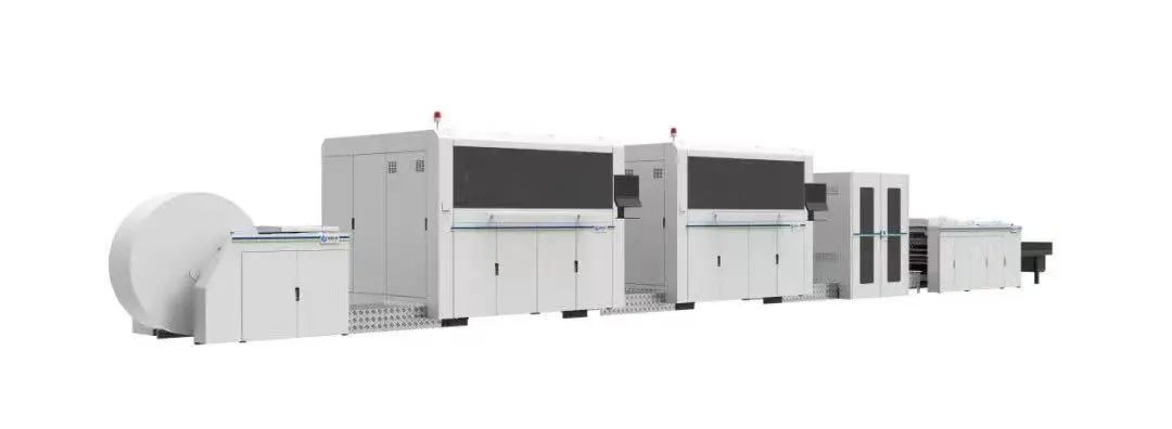 采用新一代1200 DPI 噴墨印刷技術,高解析度工業級噴頭+集成式噴墨控制系統,最高1200*1200 dpi高精度輸出,品質媲美膠印,生動的圖像品質、紋理,細節和彩色實地的還原效果在高速噴墨印刷領域達到全新水準,達到國家書刊印刷質量國標標準。實現工業化、自動化、一體化的書刊噴墨,涵蓋了從送卷、糾偏、打印、烘干、收卷以及后道裁切推疊等全生產流程。最高150 m/min高速生產,換單速度更快,非常適合工業化柔性生產,無需制版、按需噴印,足以保證客戶在日常使用中的小批量多批次訂單需求以及大規模生產訂單需求。一體化機身設計+高精度加工+先進張力控制系統,國際大品牌的核心配件,軟硬件實力卓越,確保設備長期穩定生產。