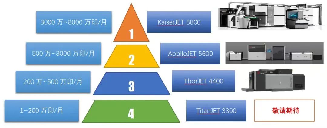天科威KaiserJET 8800及TitanJET 3300的推出,搭配現(xiàn)有產(chǎn)品ApolloJet 5600、ThorJet 4400C,一起構(gòu)建了天科威數(shù)字印刷解決方案的四層金字塔布局,以更為完善的產(chǎn)品體系,滿足不同層次、不同類(lèi)型客戶的需求。本次第九屆中國(guó)國(guó)際全印展,天科威也將對(duì)其四大主要噴墨印刷設(shè)備的強(qiáng)大生產(chǎn)能力進(jìn)行現(xiàn)場(chǎng)演示,敬請(qǐng)期待!